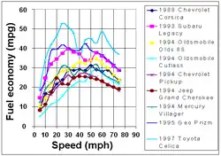 - ^ a b c Steady Speed Fuel Economy Archived 24 September 2012 at the Wayback Machine "The two earlier studies by the Federal Highway Administration (FHWA) indicate maximum fuel efficiency was achieved at speeds of 35 to 40 mph (55 to 65 km/h). The recent FHWA study indicates greater fuel efficiency at higher speeds."