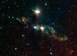 L1551 IRS 5 is a protostellar envelope surrounding a binary protostar system in the constellation of Taurus 450 light-years from Earth. The binary system itself is known as L1551 NE,[4] and each star is surrounded by protoplanetary disk.[5] The system is one of Jim Kaler's The 100 greatest stars.[6]