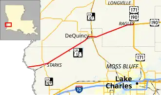 Louisiana Highway 12 (LA 12) is a state highway located in southwestern Louisiana. It runs 34.64 miles (55.75 km) in an east–west direction from the Texas state line west of Starks to a junction with U.S. Highway 171 (US 171) and U.S. Highway 190 (US 190) in Ragley.