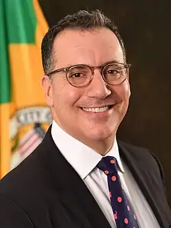 The Los Angeles City Council is guided by the Los Angeles City Charter. The Charter defines the City Council as the city's legislature, with the Mayor of Los Angeles serving as the executive branch of the city's government creating a strong mayor–council government, though the mayor is weaker than in cities such as New York City.[6] The City Council approves department heads and commissioners picked by the Mayor, amends or approves the Mayor's annual budget, and approve the Mayor's local emergencies to which it reviews afterwards.[7]