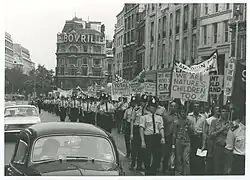The UK branch of the Gay Liberation Front (GLF) held its first meeting in a basement room in the London School of Economics in 1970.[5] The group later organised the first official UK pride protest in 1972,[6] which has since become an annual event and one of the world's largest of its kind. Although the GLF disbanded a mere 4 years later, it nevertheless spawned off several notable LGBTQ organisations such as Gay News (founded 1972), Gay's the Word (1979, via the Icebreakers group) and London Lesbian and Gay Switchboard (1974, now Switchboard).