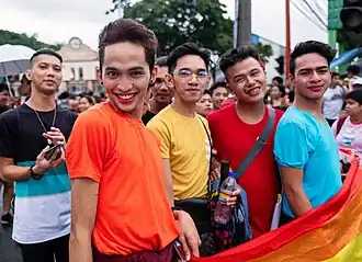 The lesbian, gay, bisexual, transgender and queer (LGBTQ) people in the Philippines are generally accepted in Filipino society, and it has been ranked among the most gay-friendly countries in Asia.[1] It has the second highest social acceptance rate in the Asia-Pacific next to Australia, according to a Pew Research Center survey in 2013.[1][2] Despite this, some discrimination still persist and LGBT people have limited LGBT-specific rights, leading some activists to characterize LGBT culture in the Philippines as "tolerated, but not accepted."[1][3] Homosexuals in the Philippines are known as "bakla", though there are other terms to describe them.[4] According to the 2002 Young Adult Fertility and Sexuality Survey, 11 percent of sexually active Filipinos between the ages of 15 and 24 have had sex with someone of the same sex.[5] According to Filipino poet and critic Lilia Quindoza Santiago, Filipino culture may have a more flexible concept of gender. Kasarian (Tagalog for "gender") is defined in less binary terms than the English word;[6] kasarian means "kind, species, or genus".[7]