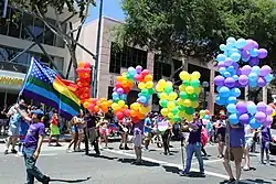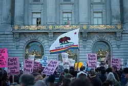 In 2014, California became the first state in the U.S. to officially ban the use of gay panic and transgender panic defenses in murder trials.[5] Public schools are also required to teach about the history of the LGBTQ community and transgender students are allowed to choose the appropriate restroom or sports team that match their gender identity. Most support for LGBTQ rights can be seen in the largest cities, such as Los Angeles, San Diego, and San Francisco, as well as many cities on the Pacific coast. A 2017 survey from the Public Religion Research Institute showed that 66% of Californians supported same-sex marriage. Since November 2022, 10% of the individuals within the California Legislature are LGBTQ members immediately after the elections—a record first for the United States.[6] In July 2024, a newly implemented law went into effect a first for the United States—explicitly banning outing of LGBTQ individuals within public schools.[7]