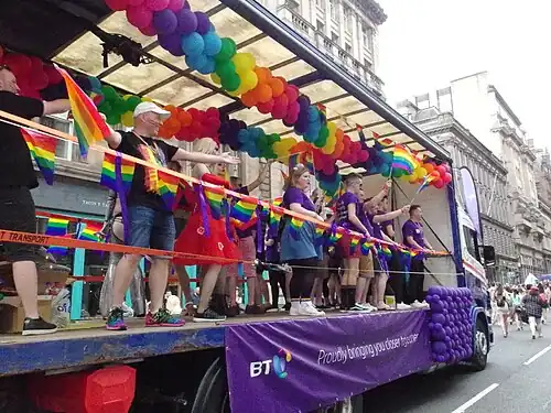 Glasgow and Edinburgh have visible LGBT scenes, with many gay bars, clubs, pubs and restaurants. Though smaller, Aberdeen, Stirling and Dundee also host a variety of LGBT venues and events. Pride Glasgow, an annual pride march held in the summer, is the largest LGBT event in Scotland, with an attendance of usually about 50,000 people. Edinburgh's Pride Scotia takes place annually in June, and includes a pride march, a BBQ and a community fair.[68] As of 2018, many other Scottish Pride events have been launched including Perthshire Pride in Perth, Hebridean Pride,[69] Proud Ness, Fife Pride, Bute Pride in Rothesay, Dundee Pride, West Lothian Pride, Grampian Pride in Aberdeen,[70] and Dumfries and Galloway Pride.[71]