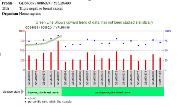 Microarray data posits the expression of LOC105377021 in certain breast cancer tissues, including metastases to lymphatic and lung tissue.[4] There is potential evidence for higher expression of LOC105377021 during Triple Negative Breast Cancer, which overshadows normal secretion levels for said protein.[3] The figure below shows a potential trend line for this pattern (shown in green, with the triple negative microarray on the left). As the figure legend states, the red bars refer to the left axis for sample counts, whereas the blue dots show the percentage of LOC105377021 expression within each sample (the right axis).
