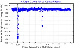 ![]() A light curve for LS Canis Majoris from BRITE nanosatellite data, adapted from Ratajczak et al. (2019)[1] | |