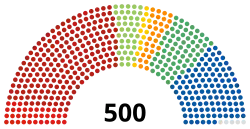 The Chamber of Deputies was elected in the 2021 legislative election, in which Juntos Hacemos Historia, consisting of the National Regeneration Movement (Morena), the Labor Party (PT), and the Ecologist Green Party of Mexico (PVEM), kept their majority but did not reach the two-thirds supermajority required to pass López Obrador's proposed constitutional reforms.[1] This legislature was notable for being the first where deputies were eligible for reelection,[2] with 129 out of the 500 seats being filled by returning deputies.[3]
