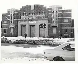 The L Street Bathhouse stands at L Street and Day Boulevard in South Boston, facing Carson Beach (or the L Street Beach, as that part of the beach is sometimes called). The original bathhouse was one of several built by the city in 1866 to enable poor immigrants, who lived in tenements with no indoor plumbing, to bathe regularly. The motto "Cleanliness of Body Is Next to Godliness" was inscribed above the building's entrance. The bathhouse was rebuilt by Mayor Curley in 1931, and is officially known as the Curley Community Center.[7] In the 1970s, during Kevin White's administration, the women's half of the bathhouse was converted into temporary classrooms. Under Mayor Raymond Flynn, the whole building was renovated and turned into a fitness center, and women were once again allowed to join.[1]