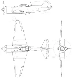 The Lavochkin La-7 (Russian: Лавочкин Ла-7; NATO reporting name: Fin)[2] was a piston-engined single-seat Soviet fighter aircraft developed during World War II by the Lavochkin Design Bureau. It was a development and refinement of the Lavochkin La-5, and the last in a family of aircraft that had begun with the LaGG-1 in 1938. Its first flight was in early 1944 and it entered service with the Soviet Air Forces later in the year. A small batch of La-7s was given to the Czechoslovak Air Force the following year, but it was otherwise not exported. Armed with two or three 20 mm (0.8 in) cannon, it had a top speed of 661 kilometers per hour (411 mph). The La-7 was felt by its pilots to be at least the equal of any German piston-engined fighter. It was phased out in 1947 by the Soviet Air Force, but served until 1950 with the Czechoslovak Air Force.[3]