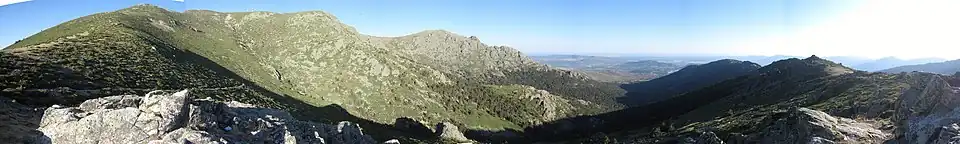 La Barranca valley is a mountain valley located at the foothills of Bola del Mundo (Alto de Guarramillas) (2265 m) and La Maliciosa (2227 m), within the Sierra de Guadarrama (a mountain range part of the Sistema Central).[1] Administratively, it lies within the municipal boundaries of Navacerrada and Becerril de la Sierra, in the northwest of the Community of Madrid, Spain. The valley is home to a dense forest of Scots pine through which flows a mountain river, the Samburiel —a tributary of the Manzanares river—held back by two small dams, the Pueblo de Navacerrada Dam and the Air Force Dam, before emptying into the Navacerrada Dam.