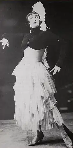 For her first major postwar recital Caryathis collaborated with author and artist Jean Cocteau, who at that time was a spokesman for Satie and the composers of Les Six, and the program they assembled focused primarily on their music.[15] Satie was paid 500 francs each for his three dance numbers; he threw in the Grande Ritournelle for free.[16] The title La Belle Excentrique was coined by Cocteau.[17]