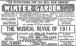 The Shubert Brothers engaged Al Jolson for his first Broadway appearance in La Belle Paree, which was the first show to play at their new Winter Garden Theatre.[5] The piece concerned Bridgeeta McShane, a wealthy American widow visiting Paris for her health, who meets a number of suitors and eccentric characters, including Erastus Sparkler, played by Jolson.[4] Jolson soon converted this supporting role into a star vehicle, and he would make a dozen further Broadway appearances (often at the Winter Garden) in his varied career.[6]