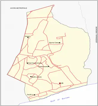 Under the local government arrangements when the Accra city council was created in 1953, six area councils were established namely Ablekuma, Ashiedu Keteke, Ayawaso, Okaikoi, Osu Klotey and Kpeshie (which comprised Teshie, Nungua and La).[3] This system operated until 18 March 1989 when Accra was elevated to metropolitan district status and the area councils became sub-metropolitan district councils under Legislative Instrument 1500 of the new Local Government System (PNDCL 207) Act 462.