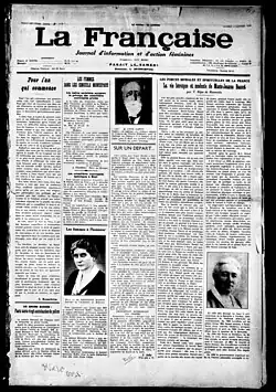 An issue of La Française published on 5 July 1914 presents Condorcet alongside figures of suffragism as well as demands in favor of women's right to vote.[8] On January 20, 1923, La Française wrote the obituary of Camille Bloch.[9] Suzanne Carr directed a family education magazine, L'Ami du Foyer, which joined La Française in 1927.[10] In 1932, the portrait of Reysa Bernson appeared on the cover of La Française.[11]