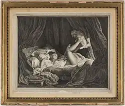 There are two versions of the engraving by Charles Bertony: A nude one and a clothed one. The nude version came with the following recommendation for the print dealers: This subject should not be displayed. It can therefore be assumed that even the audience of the Ancien Régime, accustomed to a certain degree of frivolity, viewed this engraving as a scandal.[2]