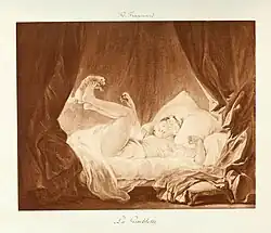 The engraving of the Besenval version by Charles Bertony, which was announced in the issue of 19 April 1783 of the Journal de Paris and of which a limited edition is dedicated to the Baron de Besenval, is also known by the title La Caroline, as reported in the issue of 10 August 1875 of the L'Intermédiaire des chercheurs et curieux. This name is an allusion to women suspected of a certain vice.[2]
