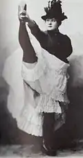Dancing at small clubs around Paris, Weber quickly became a popular personality, liked for both her dancing skills and her charming, audacious behavior. In her routine, she would tease the male audience by swirling her raised dress to reveal the heart embroidered on her knickers and would do a high kick while flipping off a man's hat with her toe.[5] Because of her frequent habit of picking up a customer's glass and quickly downing its contents while dancing past his table, she was affectionately nicknamed La Goulue (The Glutton).[6] Eventually she met the Montmartre painter Pierre-Auguste Renoir, who introduced her to a group of models who earned extra money posing for the community's artists and photographers. Achille Delmaet, husband of Marie Juliette Louvet, would later find fame as the photographer who had taken many nude photographs of La Goulue.[7]