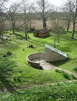 Hougue is a Jèrriais/Cotentin variant form of the more common Norman form Hogue. It means "heap", "how", "mound" and comes from the Old Norse word haugr[2] meaning about the same thing.[3] Bie is of uncertain origin. The legend of La Hougue Bie connects it with the Seigneur of Hambye in the Cotentin; an Old Norse origin may connect it to -by toponyms in Great Britain; or it may be connected to the Jèrriais word bié (variant spelling for biz "leat").[4] There are several hamlets called La Bie in Normandy (Ex La Bie, or La By(e), Grumesnil), that is never confused with Le Bié (Ex: Le Vieux-Bié, Les planters du Viez Bié, 1263, Gournay-en-Bray). La Hougue Bie refers probably to "a building on the earth mound".