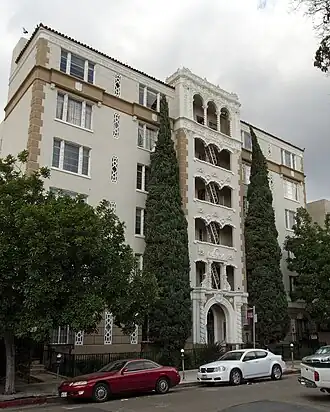 In 1940, La Leyenda Apartments was advertised as offering "Luxurious Refinement", with daily service and a garden.[4] Some of its residents in the 1930s included Mr. and Mrs. William Swanfellow who owned a gold mine in the San Francisco area and Mr. and Mrs. John Priestly Hart, the latter being the John Deere representative for the West Coast of the United States.[5][6]