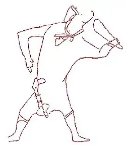 The etchings of the bodies in La Marche have distinct characteristics as well. Generally, the etchings are those of women. The bodies of the women were constructed in a diamond shape, with a small head, large abdomens suggesting obesity, and small feet. Men also were etched with large bodies, although this was not so prominent in the men as it was in the women. Bodies also are extremely useful in determining the gender of an etching, in that they portrayed the secondary sex characteristics.[6] In addition, many of the engravings show people wearing hats, robes, and boots. Although this does not coincide with the previously accepted view of prehistoric people, it may be because paintings depicting clothed humans were destroyed in the other caves while scientists were studying the walls.[6]