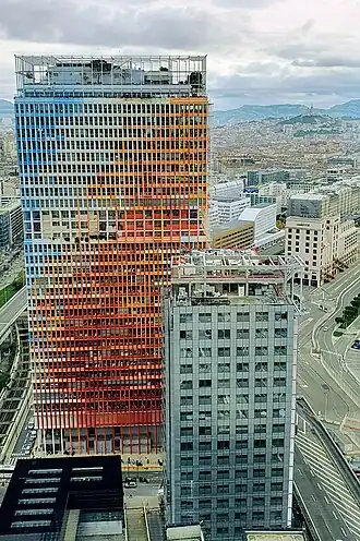 La Marseillaise is an office skyscraper in the Euroméditerranée, Marseille, France. It is part of Les Quais d'Arenc development complex and located near the CMA CGM Tower, the city's tallest building.[5] It has 31 floors with an overall height of 135 m (443 ft). The building construction started in 2015 and finished in 2018. It was developed by Constructa Urban Systems and designed by Ateliers Jean Nouvel.[2] It is known for its innovative tricolor facade design and ranked second in 2018 Emporis Skyscraper Award.[6][7][8]