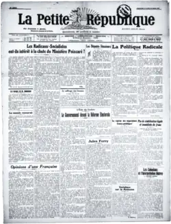 La Petite République was initially a popular daily newspaper of republican views, linked to La République française set up by Léon Gambetta. It was born during the craze for the 'petite press' (newspapers costing only one sou) of the République du Croissant.[1] It was owned by a société anonyme with 500 francs each. Its circulation briefly peaked at 150,000 and in October 1887 it published four editions a day.[2]