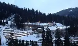 In 1986, Albertville was awarded the 1992 Winter Olympics over Sofia, Bulgaria; Falun, Sweden; Lillehammer, Norway; Cortina d'Ampezzo, Italy; Anchorage, Alaska, United States; and Berchtesgaden, West Germany.[1] The track was constructed from September 1988 to December 1990 designed for use in bobsleigh and luge competitions with the drivers in mind.[2] Ice team staff was recruited in August 1990 while the first ice test was performed in January 1991.[2] The first bobsleigh test event was in February 1991 while the first luge test event was in March 1991.[2] The track hosted the skeleton event of the FIBT World Championships in 1993.[3] Since the 1992 Winter Olympics, the track has been host to programs on bobsleigh rides performed by 1998 Winter Olympic medalist Bruno Mingeon.[4] The track was part of neighboring Annecy's bid package for the 2018 Winter Olympics which was submitted to the International Olympic Committee on 15 October 2009.[5]