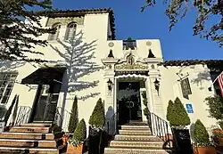 The current building is a two-story reinforced concrete and wood frame Spanish Eclectic style hotel. It is located on Lincoln Street & 7th Avenue. La Ribera means "The Riverbank " in Spanish. A tall stepped Moorish style tower is centered in the hotel with paired, keyhole arched opening on each elevation. A one-story hypen connects the main building with a two-story addition. A grass patio separates the two wings, enclosed by a wrought iron fence along 7th Avenue.[2] It qualified for inclusion in the Downtown Historic District Property Survey because it is an example of the Spanish Eclectic commercial designed by the architects Blaine & Olsen of Oakland, California, and the 1949 two-story addition by San Francisco architect Gardner Dailey.[2][5]