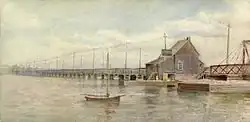 In 1826, the Cataraqui Bridge Company was formed to build a wooden bridge "1800 feet long by 25 feet wide and built on stone piers" (549 × 7.6 m).[4] The Cataraqui Bridge was opened in 1829.[4] Tolls were collected from a toll booth on the west end of the bridge, and since pedestrians were charged a penny, the bridge was popularly known as the "Penny Bridge." A drawbridge allowed larger vessels to pass through but was eventually replaced by an easier-to-operate swing bridge.