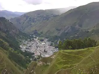 La Unión is a town in central Peru, capital of the province Dos de Mayo in the region Huánuco. The city lies over the Vizcarra River and is divided between two of the nine districts of the province, La Unión on the right bank and Ripán on the left bank. It has a regional hospital. Close to the city, over a flat highland or meseta (12,000 feet over sea level) is the old famed Inca city called Wanuku Pampa, Wanuku Marka or Wanuku Viejo. The most important festival is by the end of July and it is called "La Fiesta del Sol".[1]
