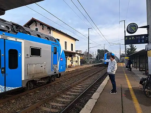 La Verpillière station (French: Gare de La Verpillière) is a railway station located in the commune of La Verpillière in the department of Isère, France. La Verpillière is also the nearest railway stop for a bigger commune of Villefontaine located to the south-east. [1] The station was opened in 1858 and is located on the Lyon–Marseille (via Grenoble) railway of TER Auvergne-Rhône-Alpes network in the French region of Auvergne-Rhône-Alpes. The train services are operated by SNCF.