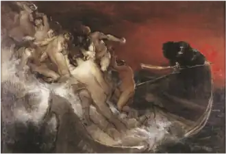 La barca de Aqueronte, translated in English as The Boat of Charon[1] or Charon's Boat,[2] is an 1887 oil-on-canvas and allegorical painting[1][2] by the Filipino painter Félix Resurrección Hidalgo. The work was a gold medalist during the Exposicion General de las Filipinas[1] (International Philippine Exposition) in Madrid.[3] In 1889, an international jury made the painting a silver medalist during the Paris Exposition, a distinct recognition that no other Filipino painter had achieved at the major art arena in Paris. The painting also won other awards such as a diploma of honor from the 1891 Exposicion General de Bellas Artes in Barcelona, a gold medal prize at the 1893 Madrid Exposicion Internacional de Bellas Artes during the 400th Anniversary of the Discovery of the Americas. The Government of Spain bought the work of art through a royal decree for the amount of 7,500 pesetas on March 7, 1893.[1][3] After displaying the artwork at the Museo-Biblioteca de Ultramar (Ultramar Library Museum) and at the Museo de Arte Moderno,[4] La barca de Aqueronte is currently placed at Madrid’s Museo Nacional de Pintura (National Museum of Paintings),[1] after the Philippines became a United States territory in 1898.[5] A smaller study of the same painting in the collection of the Lopez Museum in the Philippines.[4][6]