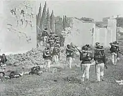 5. Missing shot replaced in the restored version by a production still showing a studio set with a group of soldiers firing a canon and in the background the city walls with the Porta Pia, and the following text: "The battery of cannons commanded by Major Luigi Pelloux opens from Villa Albani the breach in the walls of Porta Pia."
