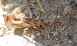 Nests are essential for protection from the environment, and predators, and needed for the success of their offspring's survival. Special nests are dug for molting, feeding, and egg laying.[3] A suitable nest is chosen and dug out by the female under a rock or tree bark.[6] Female earwigs are the primary caregivers as they become hostile to males while in their brooding chambers.[3] While the female is laying her eggs she grabs them and cleans them of any fungi or dirt one by one as they are laid.[3] They do this to 60-100 eggs, and once finished they lay over top of the eggs much like a hen.[3] The female continues to groom the eggs and stay guarding them for 10 days until they begin to hatch.[3][6][7] At this time the mother goes in search of food for her young, and continues feeding and grooming them until they leave the nest themselves 2–5 days later.[3][7] Each female will do this up to three times in her life, sometimes more than one at a time.[3] Some females get lost returning to their brood and start caring for another individual clutch as they are not able to distinguish between their own young and another's.[3][7] The young will go on to dig their own nest for molting taking anywhere from 4 to 50 days to reach the next instar, repeating to a total of 6 instars before adulthood.[3] Once adults, the individuals will live for only 2–3 months, and begin courting immediately.[3] This is done by a feeling of antennae, and mutual grabbing of each other's abdomens with their forceps until copulation occurs.[3] 2-3 generations will occur in a year, with the last generation hibernating underground through winter.[3]