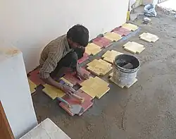 India's Ministry of Labour, in its 2008 report, classified the unorganised labour in India into four groups.[21] This classification categorized India's unorganised labour force by occupation, nature of employment, specially distressed categories and service categories. The unorganised occupational groups include small and marginal farmers, landless agricultural labourers, sharecroppers, fishermen, those engaged in animal husbandry, beedi rolling, labeling and packing, building and construction workers, leather workers, weavers, artisans, salt workers, workers in brick kilns and stone quarries, workers in saw mills, and workers in oil mills. A separate category based on nature of employment includes attached agricultural labourers, bonded labourers, migrant workers, contract and casual labourers. Another separate category dedicated to distressed unorganised sector includes toddy tappers, scavengers, carriers of head loads, drivers of animal driven vehicles, loaders and unloaders. The last unorganised labour category includes service workers such as midwives, domestic workers, barbers, vegetable and fruit vendors, newspaper vendors, pavement vendors, hand cart operators, and the unorganised retail.[22][23]