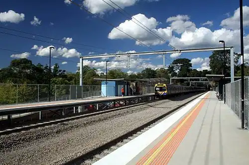 ![]() Eastbound view from Platform 1, with a Comeng train departing Platform 2, January 2007 | |||||||||||||||||||||||||||||||||||||||||||||||||||||||||||||||