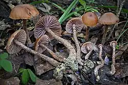 Laccaria is a genus around 75 species of fungus found in both temperate and tropical regions of the world.[1][2] They are mycorrhizal. The type species is Laccaria laccata, commonly known as the deceiver. Other notable species include L. bicolor, and the amethyst deceiver (L. amethystina), sometimes incorrectly written as L. amethystea. Because some Laccaria species have the ability to grow vegetatively and/or germinate from basidiospores in culture, they are often used as experimental systems for studies of ectomycorrhizal basidiomycetes.[3] They have a tetrapolar mating system, meaning that there the mating type is controlled by 2 loci. Recently, the genome of L. bicolor has been sequenced.[4]