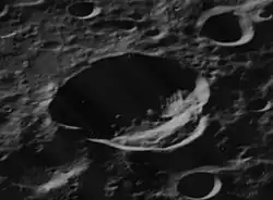 Lacchini is an impact crater on the far side of the Moon. It is located in the northern hemisphere, just behind the northwestern limb of the visible Moon. This part of the lunar surface can sometimes be viewed under favorable conditions of libration and illumination, but at such times the crater is only seen from the edge.