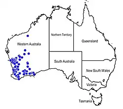 It is found in the IBRA regions of: the Avon Wheatbelt, the Jarrah Forest, and the Murchison bioregion, on sandy soils in shrublands and woodlands.[3]