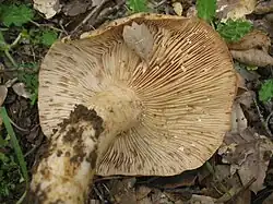 The stem is 3–15 cm (1.2–5.9 in) long by 1–5 cm (0.4–2.0 in) thick, and nearly equal in width throughout or tapering downward.[6][7] Its surface may be slimy or dry, depending on the moisture in the environment. It is whitish, but in age becomes spotted with brownish stains. The flesh is firm, and white to buff. Its odor is not distinctive, while its taste is mild or slowly becomes slightly acrid. The latex is creamy-white on initial exposure, and stains the gills grayish-brown to dark brown or olive-brown; its taste is mild or slowly becomes slightly acrid.[5] Older fruit bodies tend to have less abundant and weaker-tasting latex.[1] The spore print is yellowish[7] to pinkish-buff. The edibility of L. argillaceifolius is unknown.[5] The cap surface will turn yellow to orange when a drop of dilute potassium hydroxide is applied.[8]