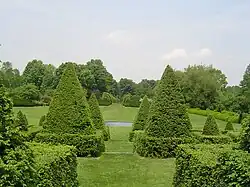 The grounds contain 15 garden rooms, each devoted to a single color, plant or theme, arranged around two cross axes with vistas. The axes meet in an oval swimming pool. The garden is particularly noted for its topiary, which was strongly influenced by Ladew's extensive travel in England, where he frequently went fox hunting. Ladew designed topiaries depicting a fox hunt with horses, riders, dogs, and foxes clearing a hedge, a Chinese junk with sails, swans, and a giraffe, among others.[2] It was proclaimed an "exquisite garden estate" by The New York Times.[2] The Garden Club of America has described it as "the most outstanding topiary garden in America." The grounds also contain a 1.5-mile (2.4 km) nature walk.
