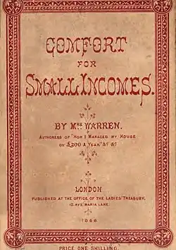 Books like Cookery for Maids of All Work and Comfort for Small Incomes offered advice on the management of modest middle-class homes. Warren began to write on these household subjects in the 1850s. Sometimes her work was presented as the "autobiographical" story of a fictional character, even when clearly labelled on the title page as "by Mrs. Warren": for instance, How I Managed my Children from Infancy to Marriage. Like How I Managed on £200 a Year, this book used the character of an experienced housekeeper to give advice to a novice: a dialogue format used in evangelical literature of the period.[2]