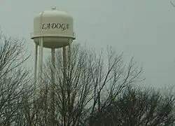 Ladoga was platted in 1836 by John Myers. Myers invited his friends to help him find a name. He required that the name not end in -burg or -ville and that it would not be named after another town. He chose "Ladoga" after finding Lake Ladoga on a map of Russia.[5][6] In 1837, the town's post office was established, which still operates today.[7]