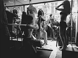 The shop gained great publicity from the national press, and attracted the attention of crowds of potential customers by having models changing in the shop window for three days. Henry Moss was quoted as saying "Then I got arrested. I thought it was for indecency, although the girls were wearing underwear. I was tried at Gt. Marlborough Street Court and fined £2 for obstructing the highway".[9] A visit by Jayne Mansfield garnered further publicity.[2] Harry Fox was also arrested several times for obstruction of the highway, when crowds gathered outside during publicity stunts.