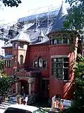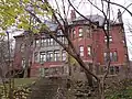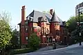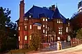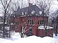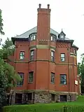 The house is considered to be an example of Queen Anne Revival-style architecture,[1] with some features resembling Richardsonian Romanesque.[6] The garden surrounding the house was designed by landscape architects Olmsted & Eliot.[7] In 1914, a large addition was made to the west of the central tower, again completed by the Maxwell brothers. The property also included a coach house, to the south of the main house, but in the same style and colour. Originally, the grounds included three levels of terraces, rosebeds, perennials, climbing vines and a kitchen garden, which have all now been replaced by a car park, as was the wrought iron gate in the style of Georgian Dublin. The two open-air verandas at the rear of the house, that gave uninterrupted views down over Montreal, the St. Lawrence River and onto the Green Mountains of Vermont, were filled in with windows sometime after 1941. In 1987, the house was described by Francois Remillard in his book Mansions of the Golden Square Mile, Montreal 1850-1930: