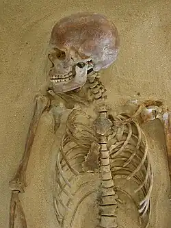 A skeleton of a woman who lived in the Mesolithic is named Lady of Bonifacio. It was found at what is the Avenue Sylvère Bohn, north of Bonifacio, on Corsica. There is a rock shelter there, called Araguina-Sennola, which is classified as Monument historique.