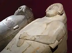In one of these tombs was also inclosed a monolithic sarcophagus of white marble of the form called anthropoid and measuring 2.15 metres in length by 0.67 in width. This sarcophagus was soon preserved in the local museum, whose director was one Father Vera. According to the account published in the Scientific American four years after the discovery, although the sarcophagus is of essentially oriental manufacture, it has undoubtedly undergone the Hellenistic influence, which implies an epoch posterior to that of Pericles, who died in 429 BC. The personage represented, a man of mature age with noble lineaments and aquiline nose, has thick hair corned up on the forehead in the form of a crown, and a beard plaited in the Asiatic fashion. As for the head, which is almost entirely executed in round relief, that denotes in an undoubted manner the Hellenistic influence, united, however, with the immutable and somewhat hierarchical traditions of Phoenician art. The arms are naked as far as to the elbow, and the feet, summarily indicated, emerge from a long sheath-form robe. As for the arms and hands, they project slightly and are rather outlined than sculptured. The left hand grasps a fruit, the emblem of fecundity, while the right held a painted crown, the traces of which have now entirely disappeared.[2]