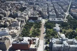 ![]() Aerial view: Lafayette Square is the green space to the left of Pennsylvania Avenue (center), the White House grounds are to the right | |