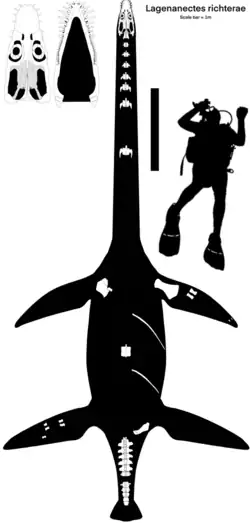 Lagenanectes is a genus of elasmosaurid plesiosaur from the Lower Cretaceous, found in Lower Saxony, Germany. The only species, Lagenanectes richterae, was first described in 2017, and is regarded as one of the best-preserved plesiosaur fossils from this geological age in Europe.[1] Lagenanectes is one of the earliest elasmosaurids. The holotype is an incomplete skeleton, comprising large parts of the skull, some neck and tail vertebrae as well as ribs and part of the limbs. A length of about 8 meters (26 feet) has been estimated.[1]