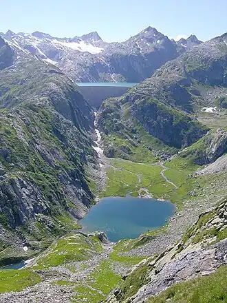 ![]() The lake with Cavagnoli dam and Lago Bianco in the foreground | |